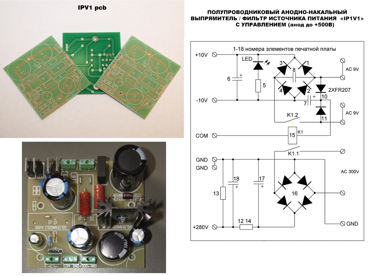 "IP1V1" полупроводниковый анодно-накальный выпрямитель / фильтр источника питания с управлением (анод до +500В) - печатная плата размер 85 мм х 90 мм