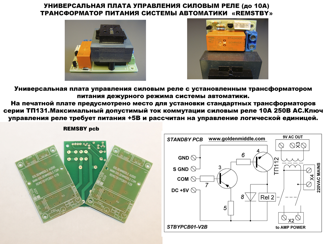 Универсальная плата управления силовым реле с установленным трансформатором питания дежурного режима системы автоматики. На печатной плате предусмотрено место для установки стандартных трансформаторов серии ТП131. Максимальный допустимый ток коммутации силовым реле 10А 250В АС. Ключ управления реле требует питания +5В и рассчитан на управление логической единицей.